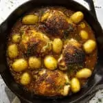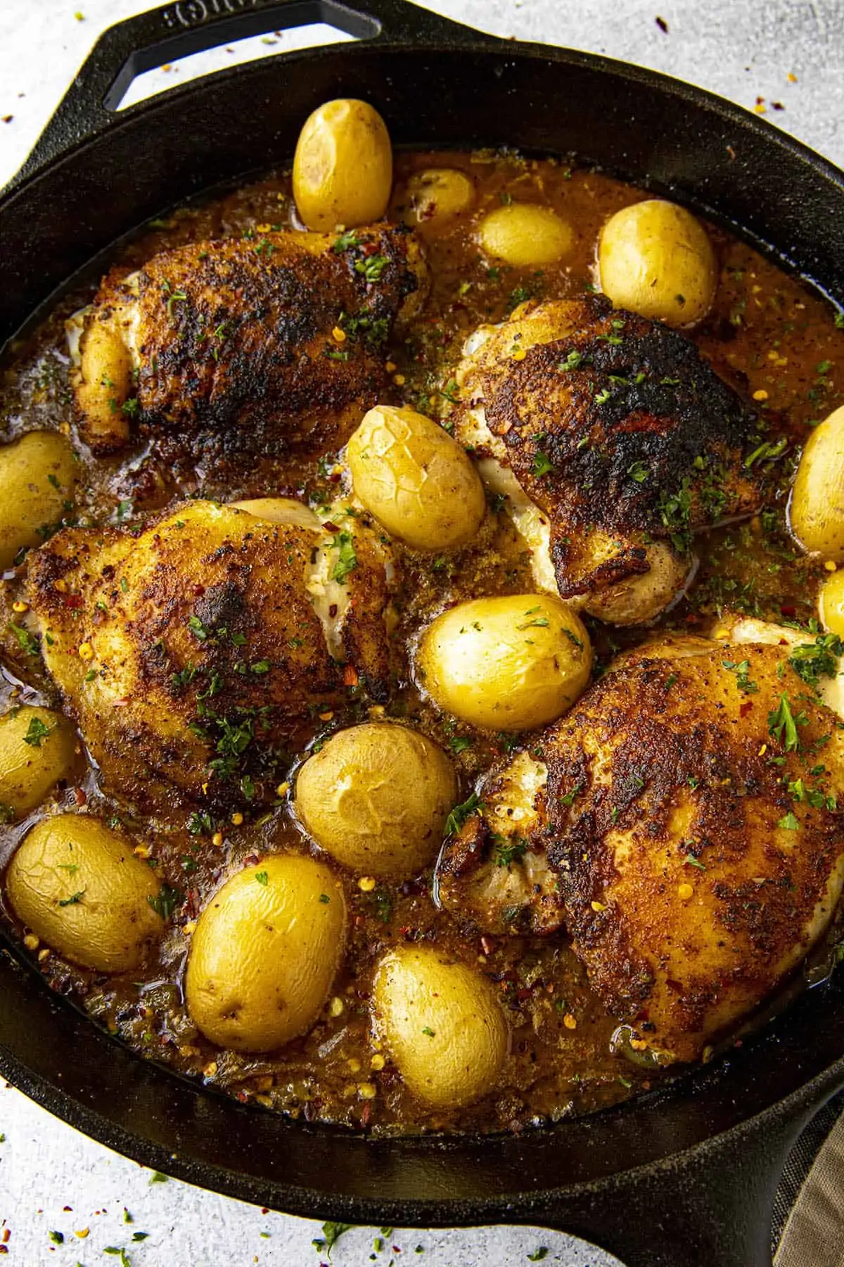 - Add chicken thighs back to the pan along with the baby potatoes.
