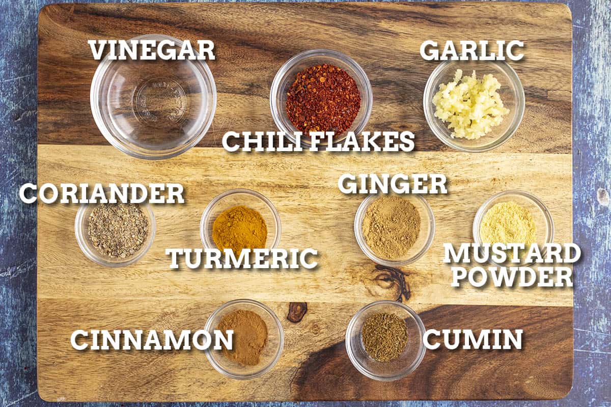 Vinegar is a MUST, as is garlic. From there, we're adding in a number of pungent spices to make this amazing, including paprika, ginger, coriander, turmeric, mustard powder, cumin, cinnamon, and a healthy dose of spicy red chili flakes, and salt and pepper, of course.