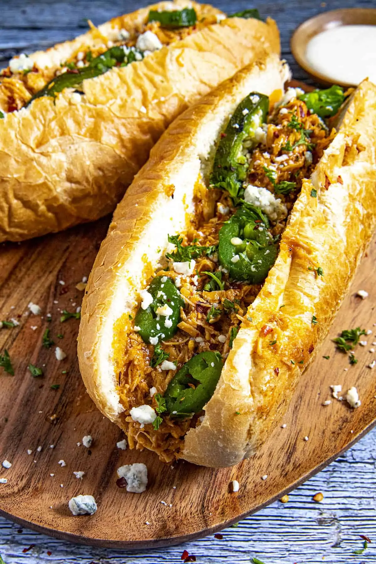 I love mine with roasted jalapeno slices and extra blue cheese. We're basically taking all the wonderful flavors of buffalo chicken wings and turning them into a sandwich. I think you're going to love this recipe.