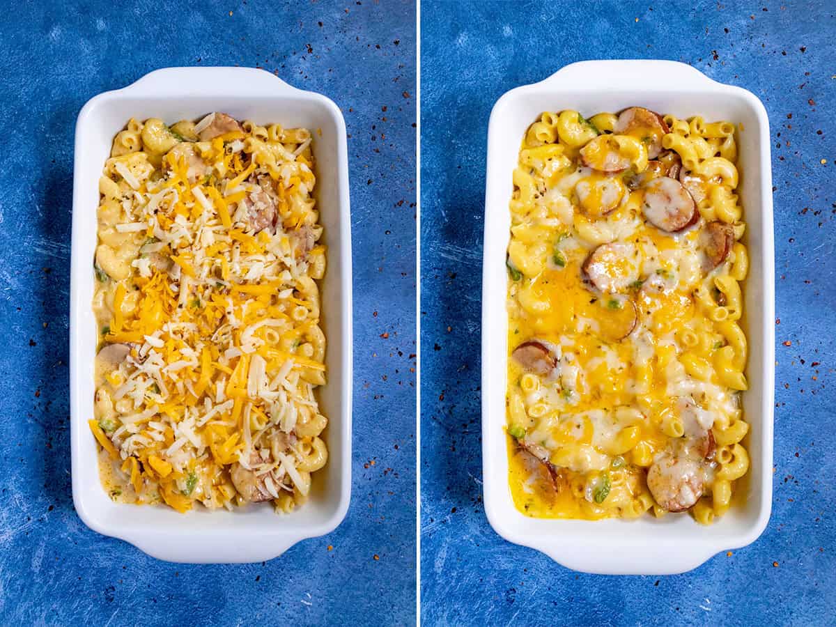 - Add the drained pasta to the sauce and stir to coat evenly. Stir in the cooked andouille and vegetables. Serve right away for a creamy stovetop version (topped with the reserved cheese), or bake it for a bubbly/cheesy mac and cheese with an optional crisp, golden crust.